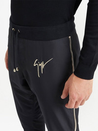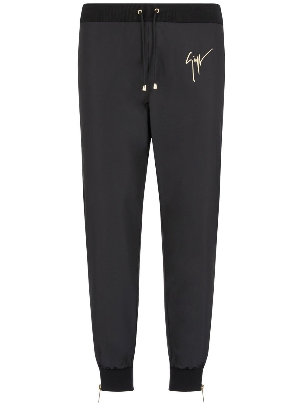 logo-print track pants black logo print at the leg side zip fastening elasticated ankles elasticated drawstring waistband tapered leg Made in Italy Composition Polyester 100%