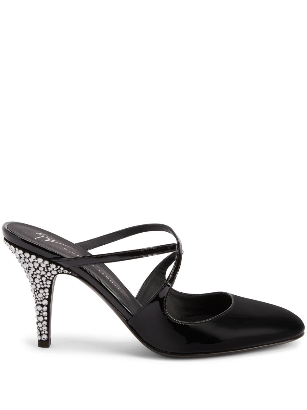 85mm Marthe crystal-embellished sandals Highlights - Black - Leather - Patent finish - Almond toe - Crystal embellishment - Crossover strap detail - Backless - Branded insole - Slip-on style - Cone heel Made in Italy Composition Outer: Fabric 100% Sole: Leather 100% Lining: Fabric 100%