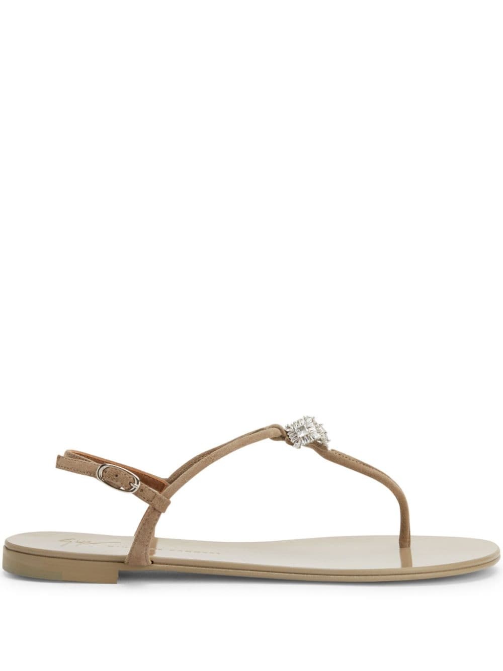 Maryland crystal-embellished sandals Highlights - Sand beige - Calf leather/suede - Crystal embellishment - Thong strap - Side buckle fastening - Branded footbed - Flat leather sole Made in Italy Composition Outer: Suede 100% Sole: Leather 100%, Calf Leather 100% SIZE & FIT Measurement HEEL 0.39 in(1 cm)