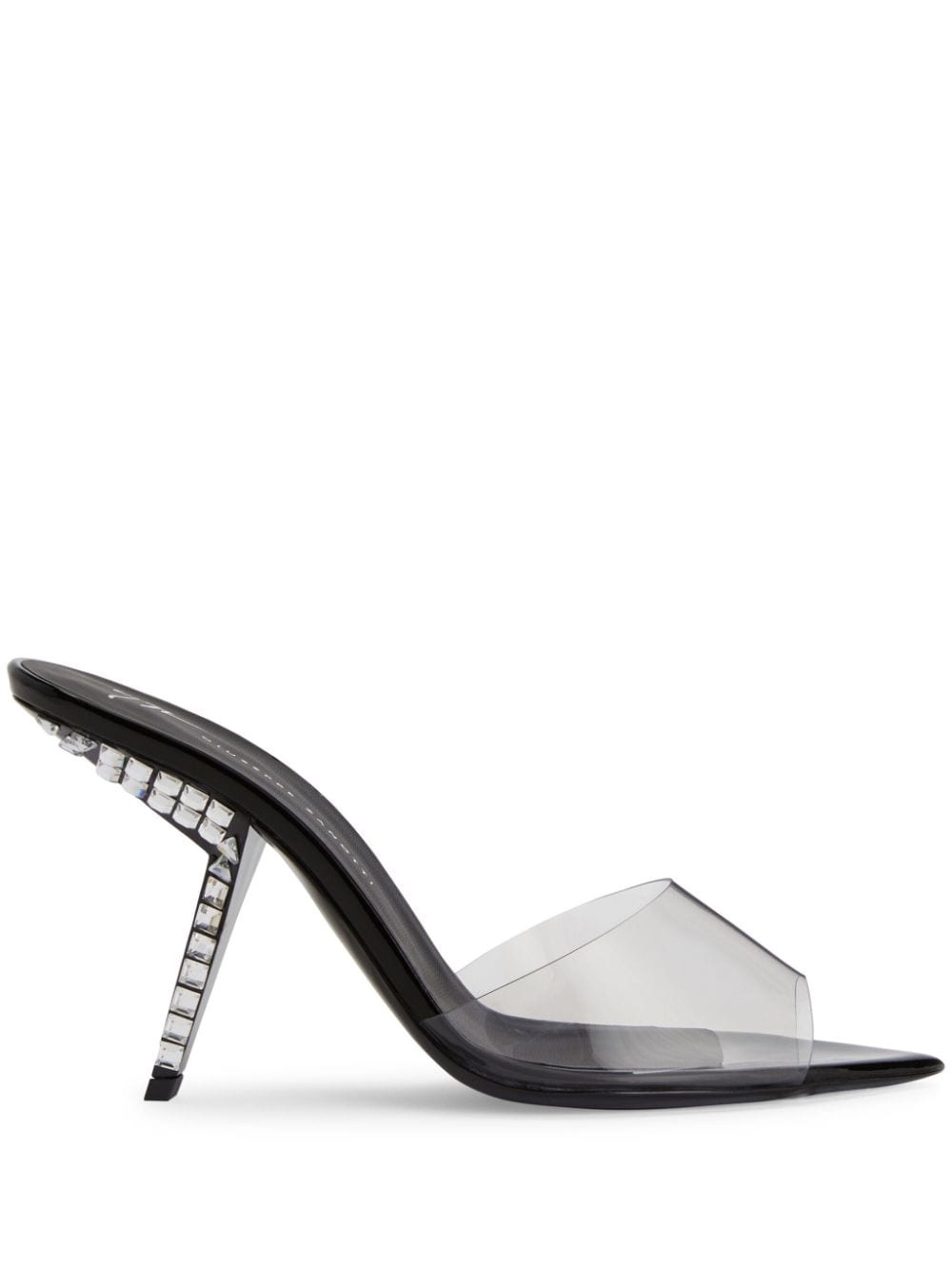 90mm Mystero sandals Highlights - Black - Transparent strap - Rhinestone embellishment - Open toe - Branded leather insole - High sculpted heel Made in Italy Composition PVC 100% SIZE & FIT Measurement HEEL 3.54 in(9 cm)