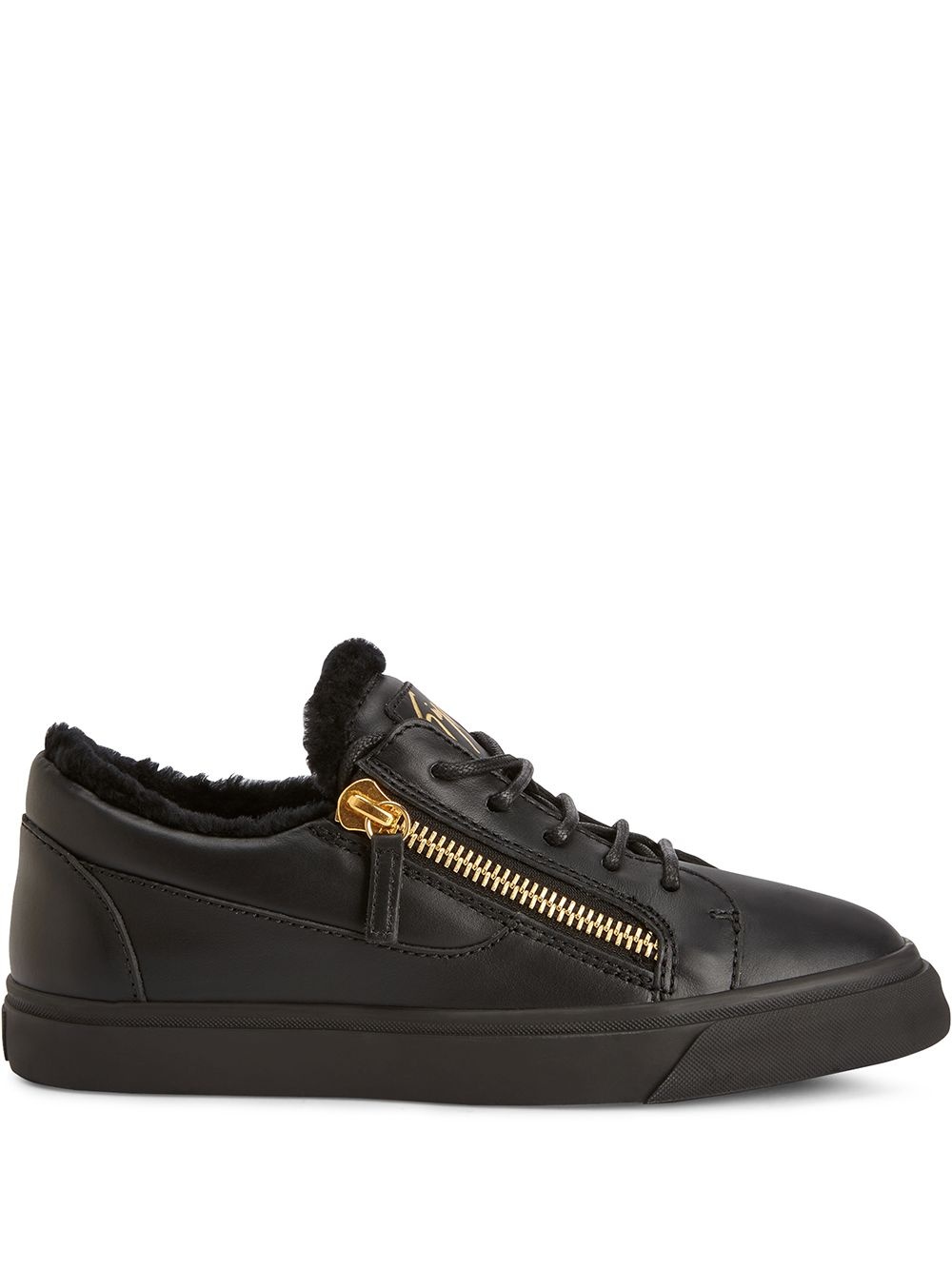Nicki low-top sneakers black leather/shearling gold-tone hardware round toe front lace-up fastening side zip fastening logo patch at the tongue shearling lining branded insole flat rubber sole Made in Italy Composition Outer: Bovine Leather (top grain) 100% Sole: Rubber 100% Lining: Sheep Skin/Shearling 100%