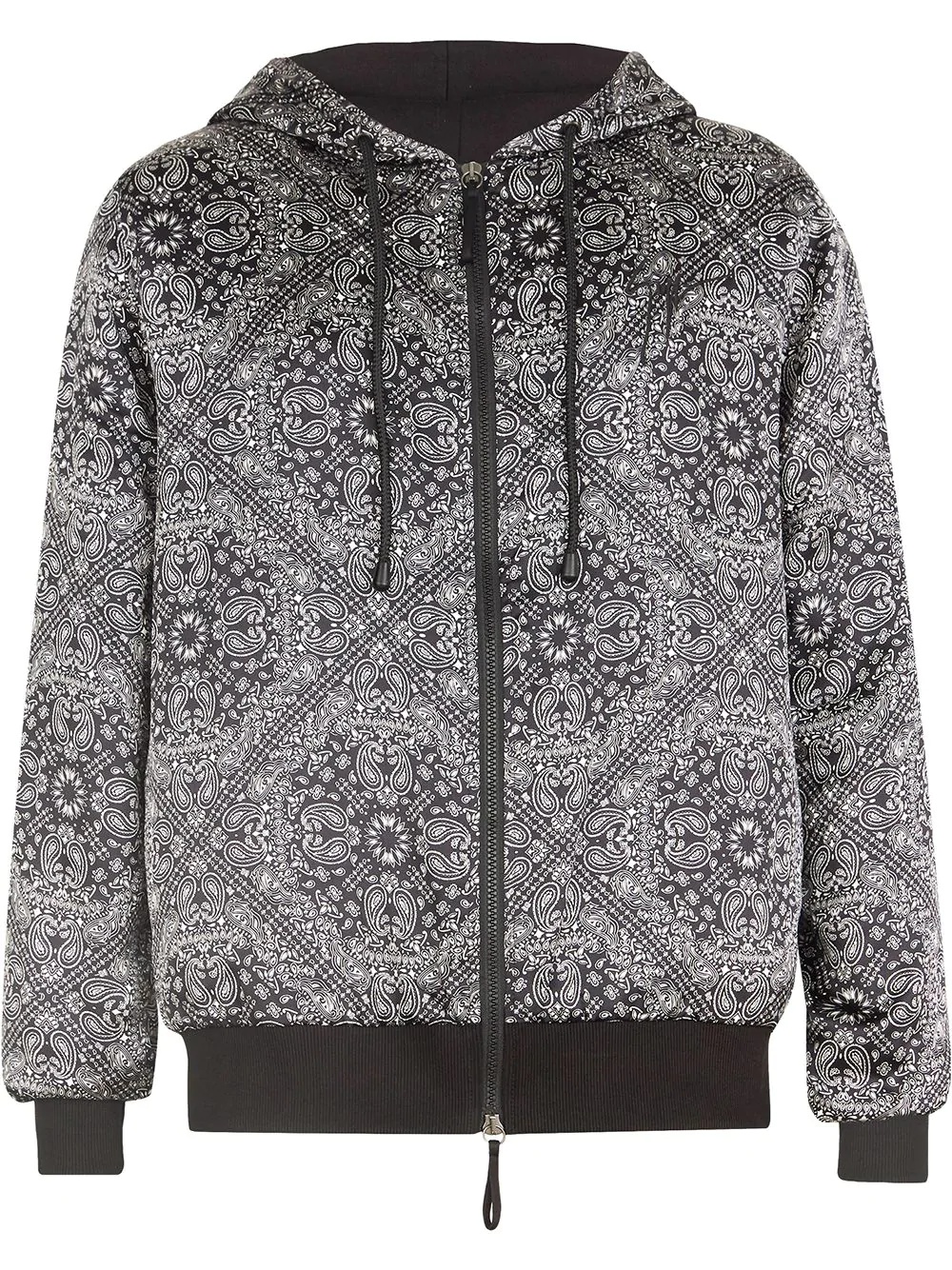 paisley print hooded jacket black/white silk ribbed detailing paisley print two-tone design drawstring hood front zip fastening long sleeves Made in Italy Composition Silk 100% Washing instructions Dry Clean Only