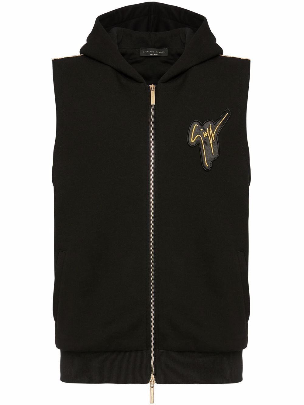 sleeveless zip-front hoodie black cotton logo patch at the chest classic hood front zip fastening sleeveless two side slit pockets elasticated hem Made in Italy Composition Cotton 100%