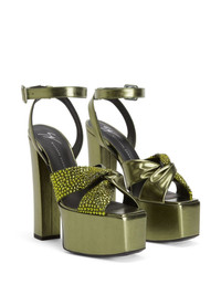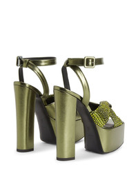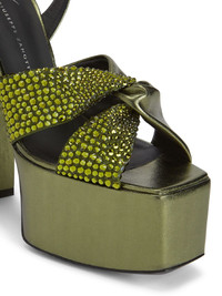 Souree 150mm crystal-embellished sandals Highlights - Green - Leather - Crystal embellishment - Crossover strap at the toe - Open toe - Buckle-fastening ankle strap - Branded insole - 150mm block heel - Platform sole Made in Italy Composition Outer: Fabric 100%, Satin 100% Sole: Leather 100% Trims: Rhinestone 100% SIZE & FIT Measurement HEEL 5.9 in(15 cm)