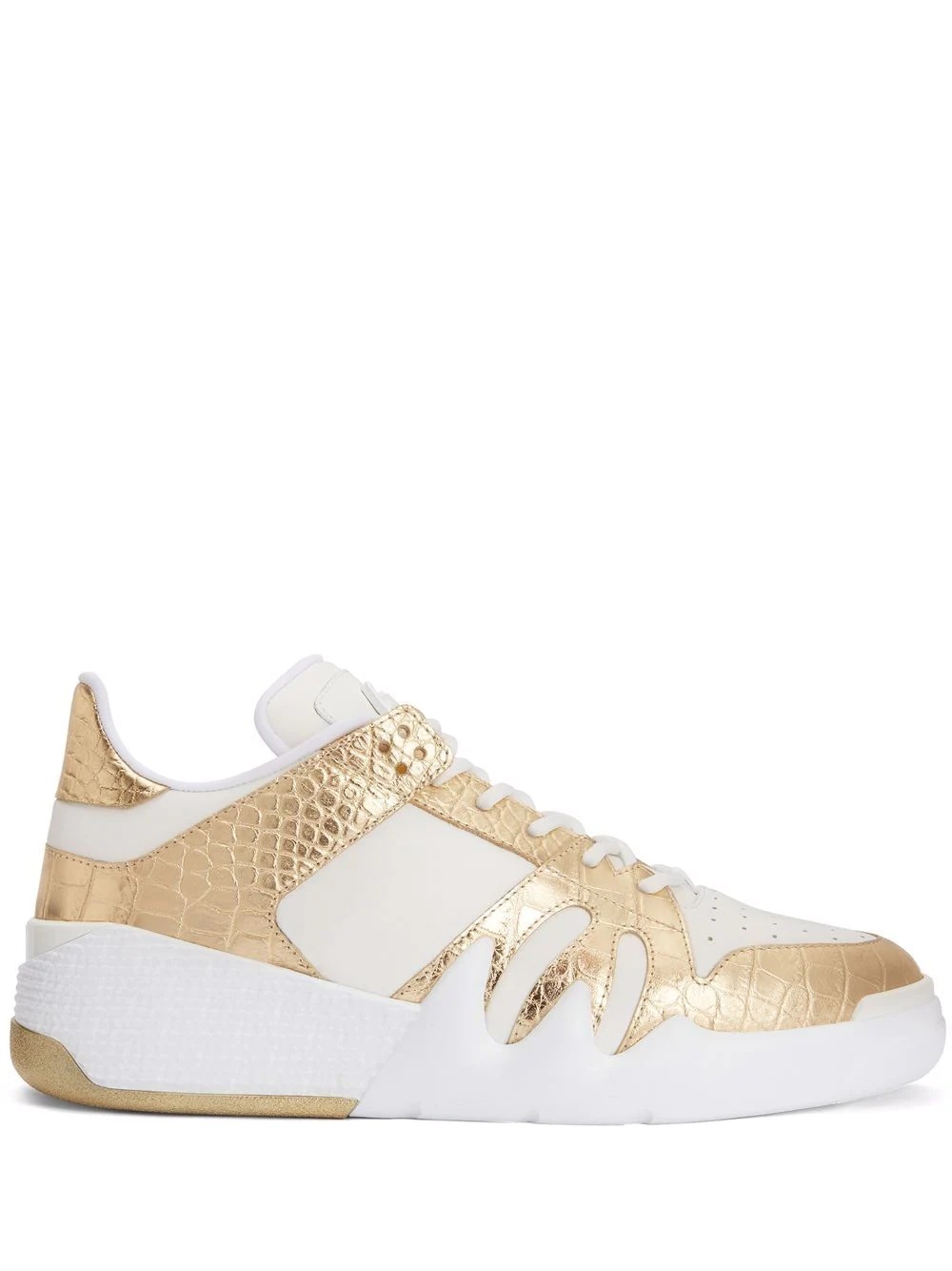 Talon crocodile-effect leather low-top sneakers Highlights - White/gold - Leather - Embossed crocodile effect - Colour-block design - Perforated detailing - Round toe - Front lace-up fastening - Logo plaque at the tongue - Branded insole - Flat rubber sole Made in Italy Composition Sole: Rubber 100% Lining: Leather 100% Outer: Leather 100% SIZE & FIT Measurement HEEL 0.98 in(2.5 cm)