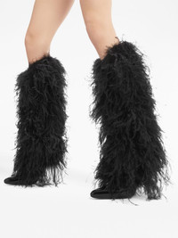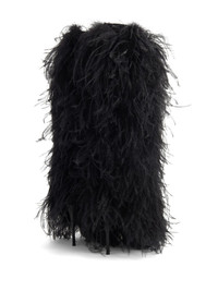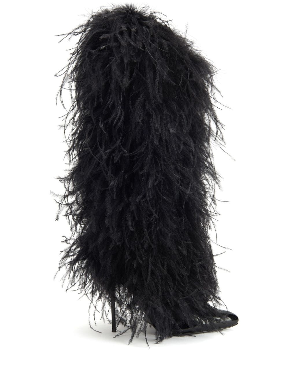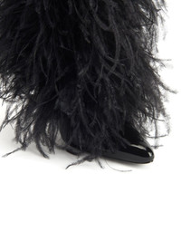 Xylia 105mm knee boots Highlights - Black - Leather - Patent finish - Layered design - Feather detailing - Pointed toe - Slip-on style - High stiletto heel Made in Italy Composition Outer: Satin 100%, Patent Leather 100%, Ostrich Feather 100% Sole: Leather 100% Lining: Fabric 100% SIZE & FIT Measurement HEEL 4.13 in(10.5 cm)