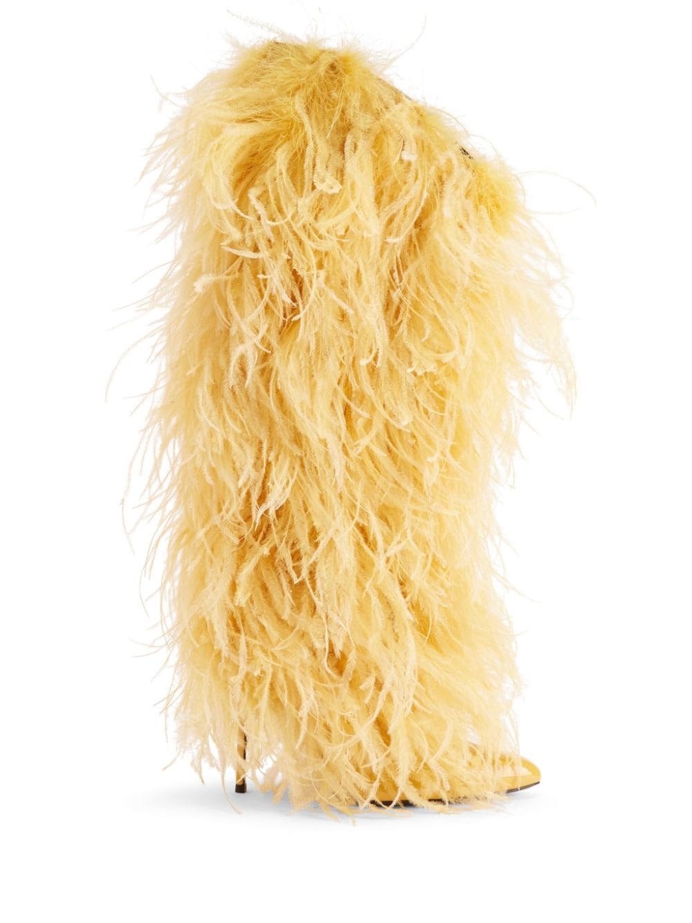 105mm Xylia knee-high boots Highlights - Mustard yellow - Leather - Satin finish - Layered details - Feather detailing - Pointed toe - Slip-on style - High stiletto heel Made in Italy Composition Outer: Satin 100%, Ostrich Feather 100%, Patent Leather 100% Sole: Leather 100% Lining: Fabric 100% SIZE & FIT Measurement HEEL 4.13 in(10.5 cm)