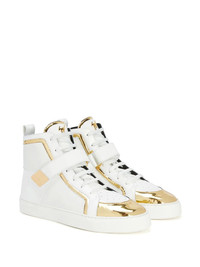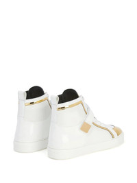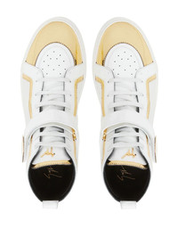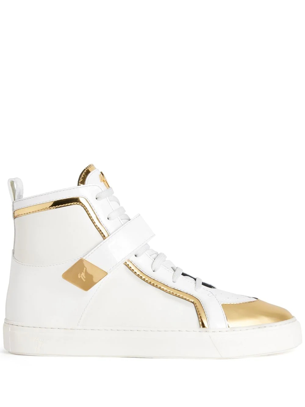 Zenas high-top sneakers Zenas high-top sneakers from Giuseppe Zanotti featuring white, gold, leather, panelled design, round toe, front lace-up fastening, front touch-strap fastening, logo plaque at the tongue, ankle-length, pull-tab at the heel and flat rubber sole. Made in Italy Composition Leather 100%