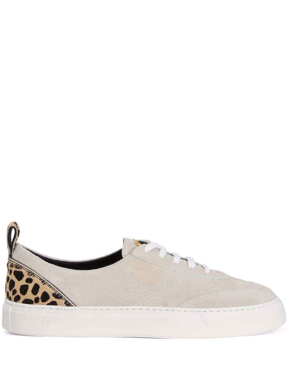 Zenas low-top sneakers beige/brown suede/pony fur/leather leopard print round toe front lace-up fastening logo plaque at the tongue pull-tab at the heel branded insole flat rubber sole Made in Italy Composition Suede 100%
