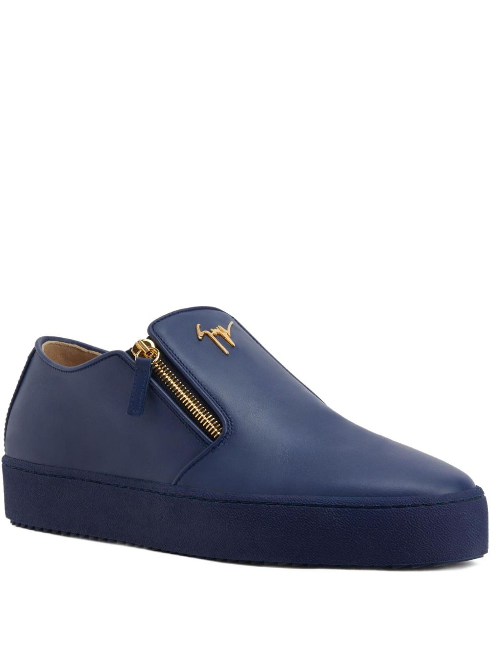 zip-detail leather slip-ons Highlights - Dark blue - Leather upper - Side zips fastenings - Gold-tone logo - Flat rubber sole - Round toe Made in Italy Composition Lining: Fabric 100% Outer: Leather 100% Sole: Rubber 100%