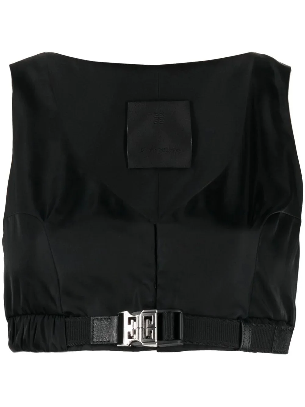 4G buckle vest top 4G buckle vest top from GIVENCHY featuring black, V-neck, panelled design, elasticated hem, front buckle fastening and internal logo patch. Made in Italy Composition Polyamide 100% Washing instructions Dry Clean Only