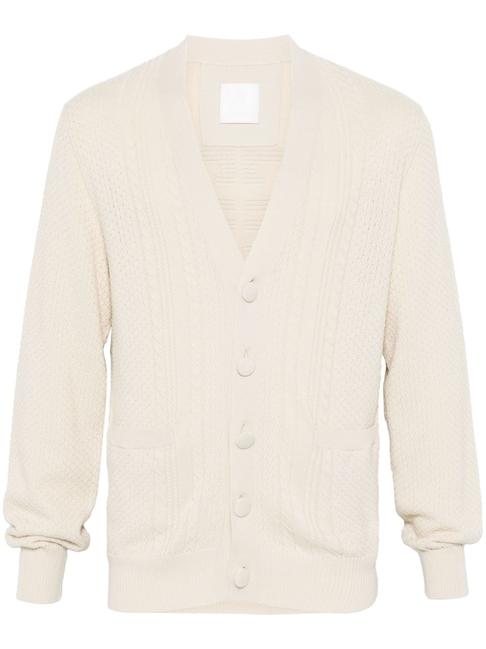 4G cable-knit cardigan Highlights - Ecru - Cotton - Cable knit - Honeycomb knit - Signature 4g motif to the rear - Front button fastening - Ribbed v-neck - Long sleeves - Ribbed cuffs and hem - Two front patch pockets - Straight hem Made in Italy Composition Cotton 100% SIZE & FIT Model measurements Height 6 ft 2 in(1.87 m) Bust/Chest 35.82 in(91 cm) Hips 35.82 in(91 cm) Waist 31.88 in(81 cm) FittingInformation Designed for a relaxed fit, this piece allows for comfort and movement when worn The ribbed hem offers a close, comfortable fit Made with a midweight knit, this piece offers some stretch