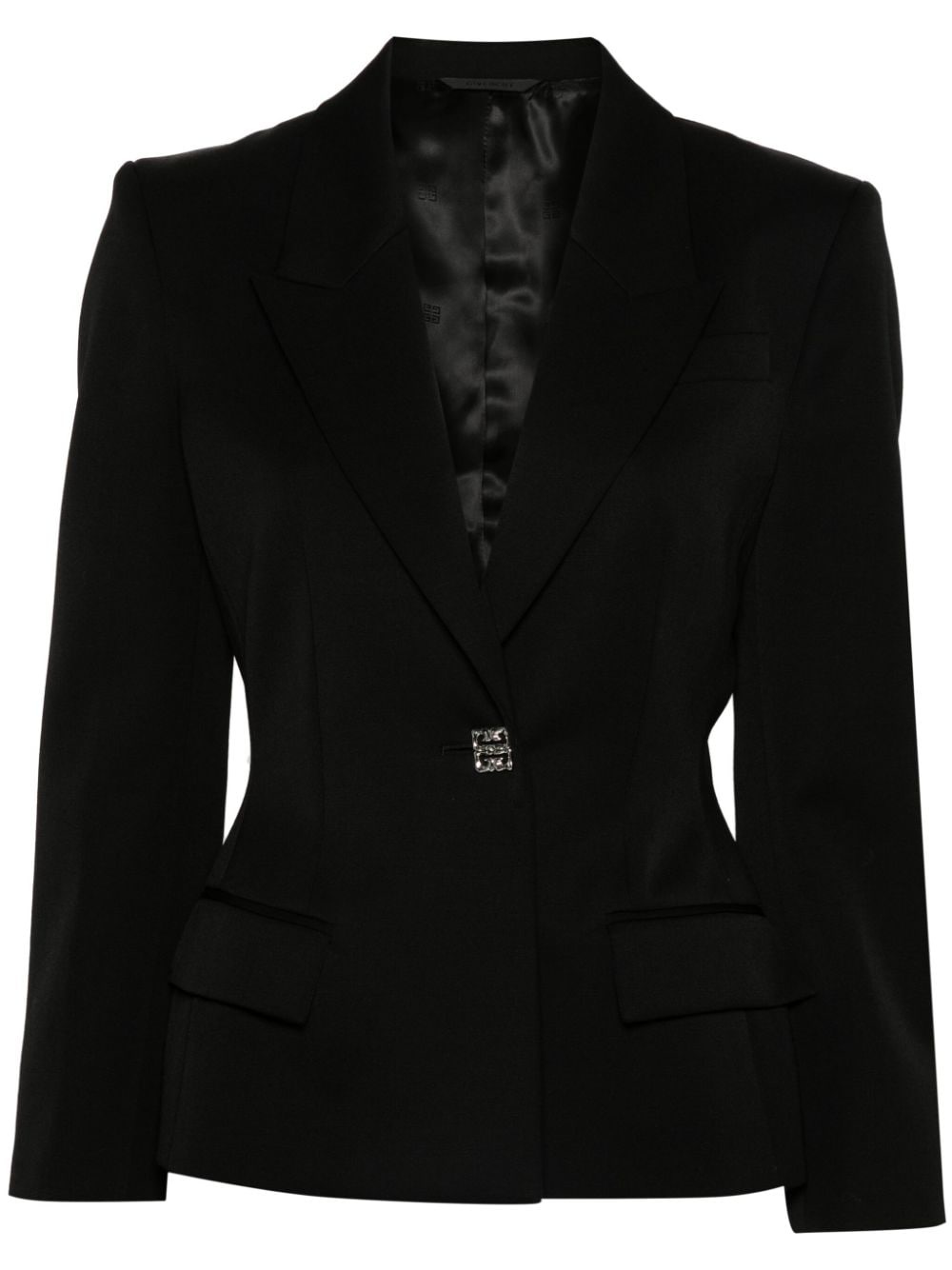 4G Liquid-button wool blazer Highlights - Black - Virgin wool - Peak lapels - Long sleeves - Buttoned cuffs - Chest welt pocket - Dart detailing - Two side flap pockets - Internal slip pocket - Logo-jacquard lining - Straight hem - 4g liquid metal button - Front button fastening Made in Italy Composition Outer: Virgin Wool 100% Lining: Cupro 100% SIZE & FIT Model measurements Height 5 ft 10 in(1.78 m) Bust/Chest 33.07 in(84 cm) Hips 36.61 in(93 cm) Waist 24.8 in(63 cm) FittingInformation Designed for a slim fit that sits just away from the body offering a close yet comfortable fit The internal shoulder pads offer a structured shape Made from a midweight non-stretch fabric This piece fits true to size – take your usual size