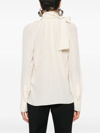 4G silk crepe blouse Highlights - Eggshell white - Silk - Crepe texture - Gathered tie neck - Long sleeves - Buttoned cuffs - Signature 4g motif - Straight hem Made in Italy Composition Silk 100% SIZE & FIT Model measurements Height 5 ft 9 in(1.76 m) Bust/Chest 31.88 in(81 cm) Hips 35.43 in(90 cm) Waist 24.8 in(63 cm) FittingInformation Designed to be unstructured, offering a loose fit throughout The tie fastening gives an adaptable and personalised fit Made from a lightweight non-stretch fabric This piece fits true to size – take your usual size