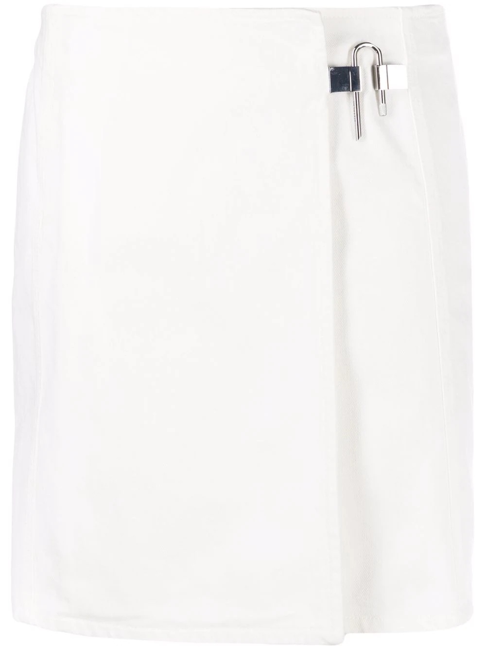 asymmetric padlock skirt Uncomplicated in its clean white cotton construction, this asymmetric skirt from Givenchy is off-set with the chunky silver-tone padlock fastening at the front. Made in Italy Composition Cotton 100% SIZE & FIT Model measurements Height 5 ft 10 in(1.79 m) Bust/Chest 33.07 in(84 cm) Hips 35.82 in(91 cm) Waist 24.01 in(61 cm) FittingInformation This piece fits true to size. We recommend you get your regular size Designed to be fitted at the waist and hips, loose over the leg Made with a mid-weight non-stretch fabric Washing instructions Dry Clean Only