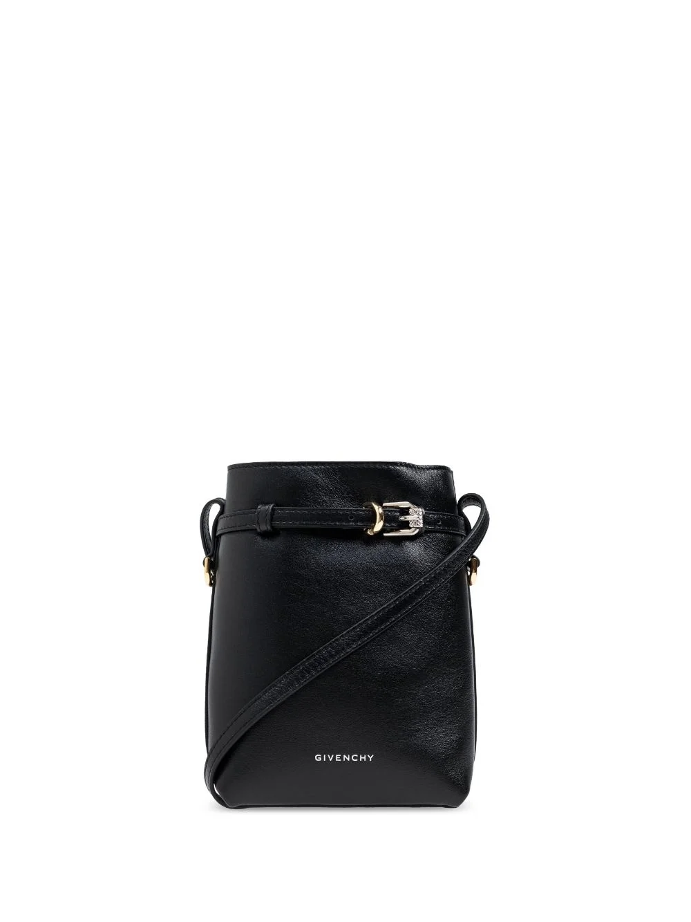 VOYOU - CROSSBODY PHONE POUCH Highlights - Black - Calf leather - Logo print to the front - Belt detailing - Gold-tone hardware - Open top - Detachable shoulder strap - Internal logo stamp - Main compartment Made in Italy Composition Outer: CALFSKIN 100% SIZE & FIT Measurement HEIGHT 7.48 in(19 cm) WIDTH 5.51 in(14 cm)