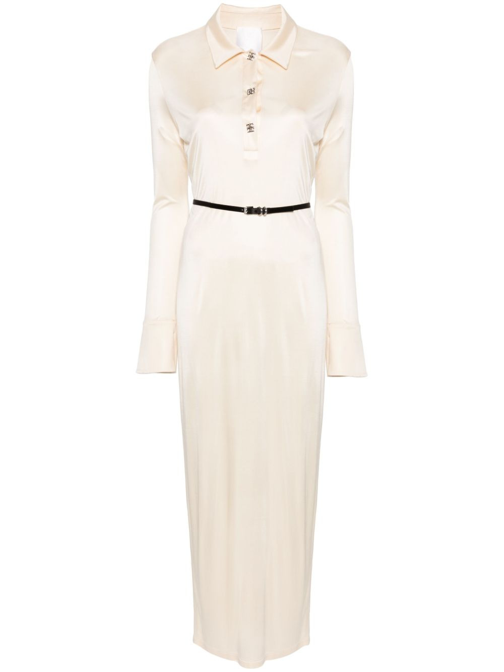 4G-motif maxi dress Highlights - Light beige - Satin weave - Classic collar - Long sleeves - Split cuffs - Belted waist - Straight hem - Long length - Short front button fastening with signature 4g motif Made in Italy Composition Viscose 100% SIZE & FIT Model measurements Height 5 ft 9 in(1.76 m) Bust/Chest 31.88 in(81 cm) Hips 35.43 in(90 cm) Waist 24.8 in(63 cm) Measurement SLEEVE LENGTH 26.49 in(67.3 cm) HIPS 35.98 in(91.4 cm) LENGTH 54.01 in(137.2 cm) WAIST 30 in(76.2 cm) BUST 35 in(88.9 cm) FittingInformation Designed for a slim fit that sits just away from the body offering a close yet comfortable fit The belt offers adjustability for fitted preferences Made from a midweight non-stretch fabric, this piece offers minimal elasticity when worn This piece fits true to size – take your usual size
