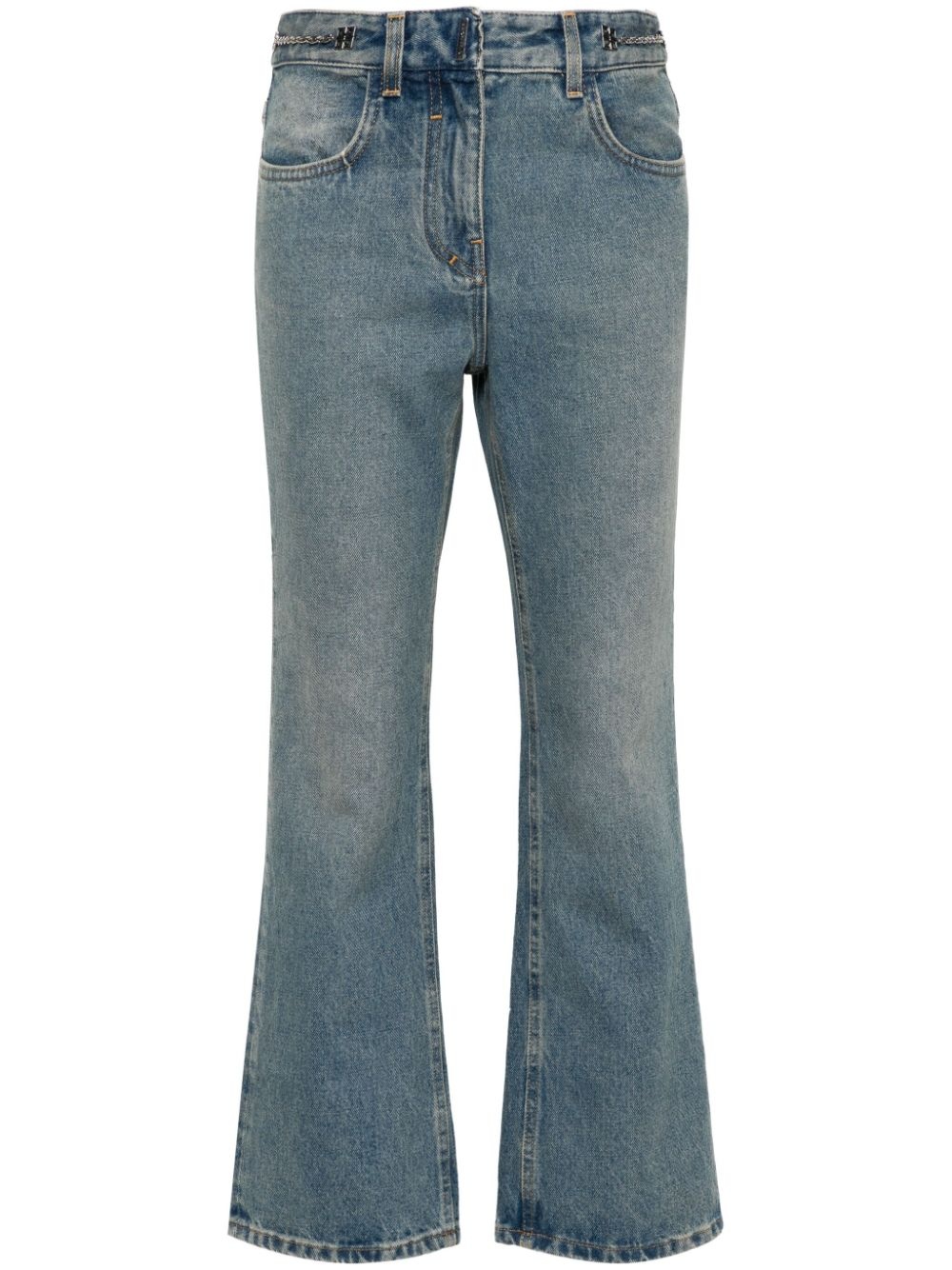 bootcut chain-detail jeans Highlights - Medium blue - Cotton - Denim - Whiskering effect - Belt loops - Two rounded pockets to the sides - 4g metal chain embellishment - Two rear patch pockets - Rear 4g metal rivets - Bootcut - Concealed fly and button fastening Made in Italy Composition Lining: Polyester 65%, Cotton 35% Outer: Cotton 100% SIZE & FIT Model measurements Height 5 ft 9 in(1.75 m) Bust/Chest 32.67 in(83 cm) Hips 36.22 in(92 cm) Waist 24.8 in(63 cm) FittingInformation Designed with a flared hem, these jeans allow for a close fit at the waist with a slim fit over the leg and widening towards the hem Sturdy and hard-wearing, this denim piece offers no stretch This piece fits true to size – take your usual size