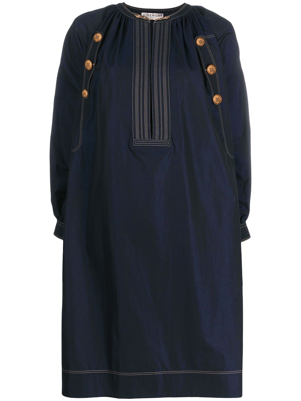 button details poplin dress Givenchy is the name; style is the game. Made from cotton, this navy blue dress has a round neck, long sleeves, a relaxed style, gold-tone hardware and a panel at the chest. Up your sartorial game. Made in Italy Composition Cotton 100% SIZE & FIT FittingInformation This piece fits true to size. We recommend you get your regular size Cut for a loose fit Made with a mid-weight non-stretch fabric Washing instructions Dry Clean Only