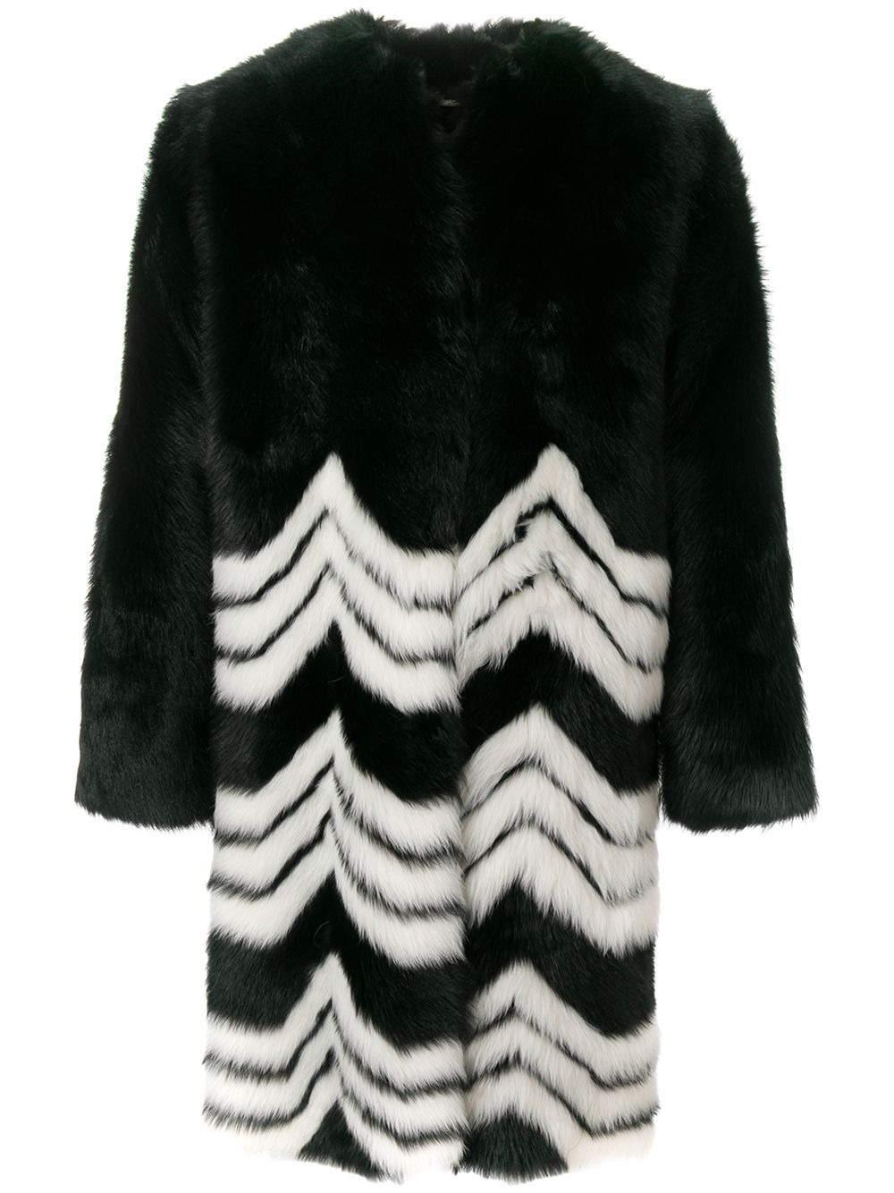 chevron coat Black and white lamb fur, lamb skin and silk chevron coat from Givenchy featuring a collarless design, a round neck, long sleeves, a mid-length, a chevron pattern, a snap button closure and a full lining. Made in Italy Composition Lamb Fur 100%, Lamb Skin 100%, Silk 100%, Polyester 100% SIZE & FIT Model measurements Height 5 ft 9 in(1.76 m) Bust/Chest 32.67 in(83 cm) Hips 35.43 in(90 cm) Waist 24.01 in(61 cm)