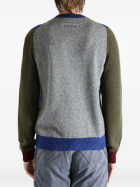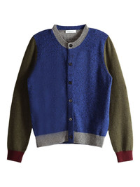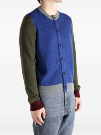 colour-block wool cardigan Highlights - Blue - Speckled effect - Olive green sleeves - Grey hem - Button fastening - Maroon ribbed cuffs Made in Italy Composition Wool 100% Washing instructions Read Manufacturer Guidelines
