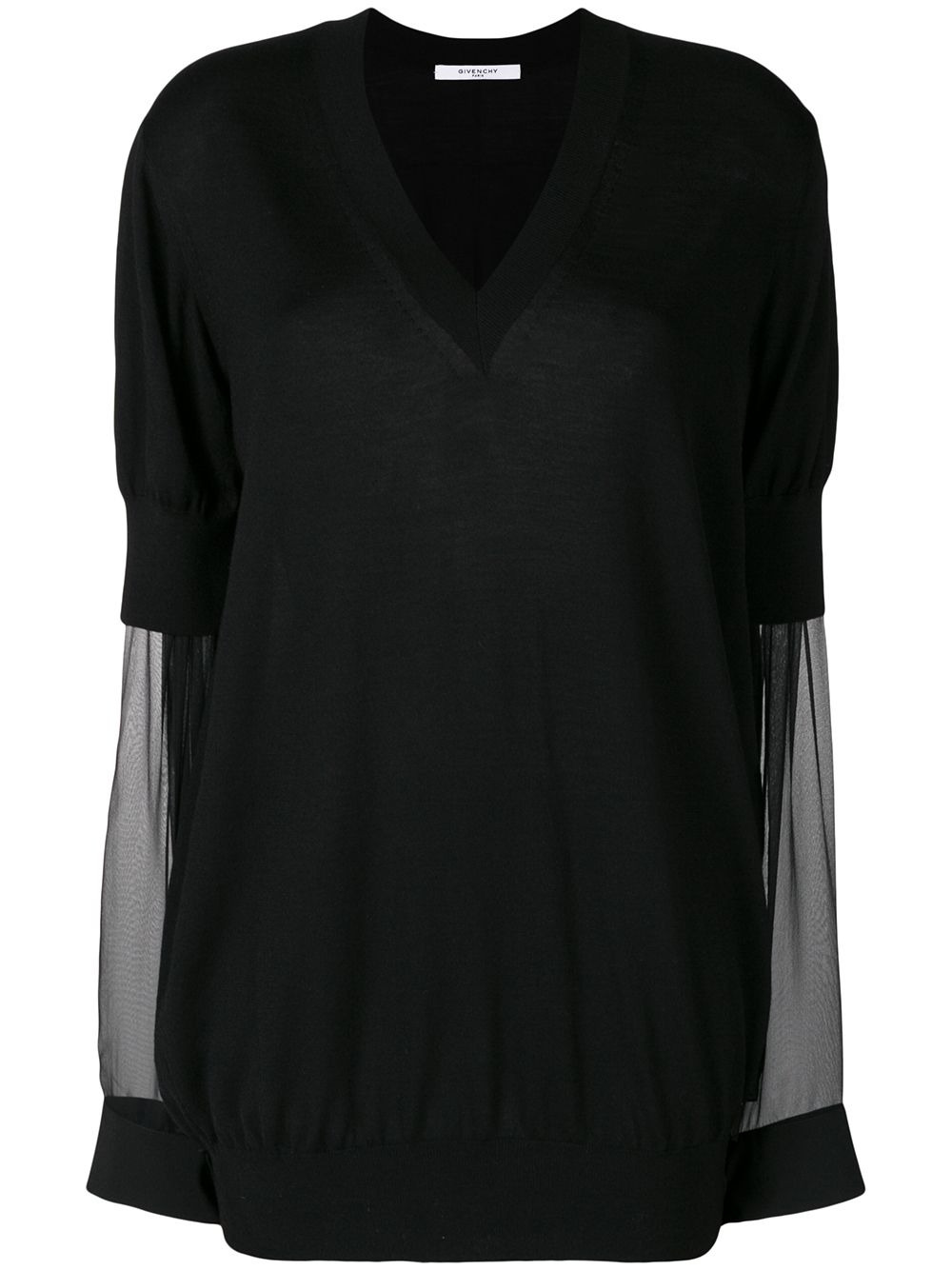 deep v-neck top Givenchy is an international luxury brand, known worldwide for its Haute Couture and ready-to-wear collections. His sophisticated manner and very feminine style was injected into this collection.Black wool blend deep v-neck top from Givenchy featuring panelled long sleeves, elasticated cuffs, an elasticated waistband and transparent inserts on the sleeves. Made in Italy Composition Wool 70%, Silk 30% SIZE & FIT Model measurements Height 6 ft 2 in(1.88 m) Bust/Chest 35.82 in(91 cm) Hips 37 in(94 cm) Waist 29.92 in(76 cm) Washing instructions Dry Clean Only