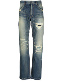distressed straight-leg jeans Highlights - Indigo blue - Cotton - Washed denim - Distressed finish - Belt loops - Whiskering effect - Mid-rise - Straight leg - Front button and zip fastening - Two diagonal pockets to the sides - Two rear patch pockets Imported Composition Cotton 100%