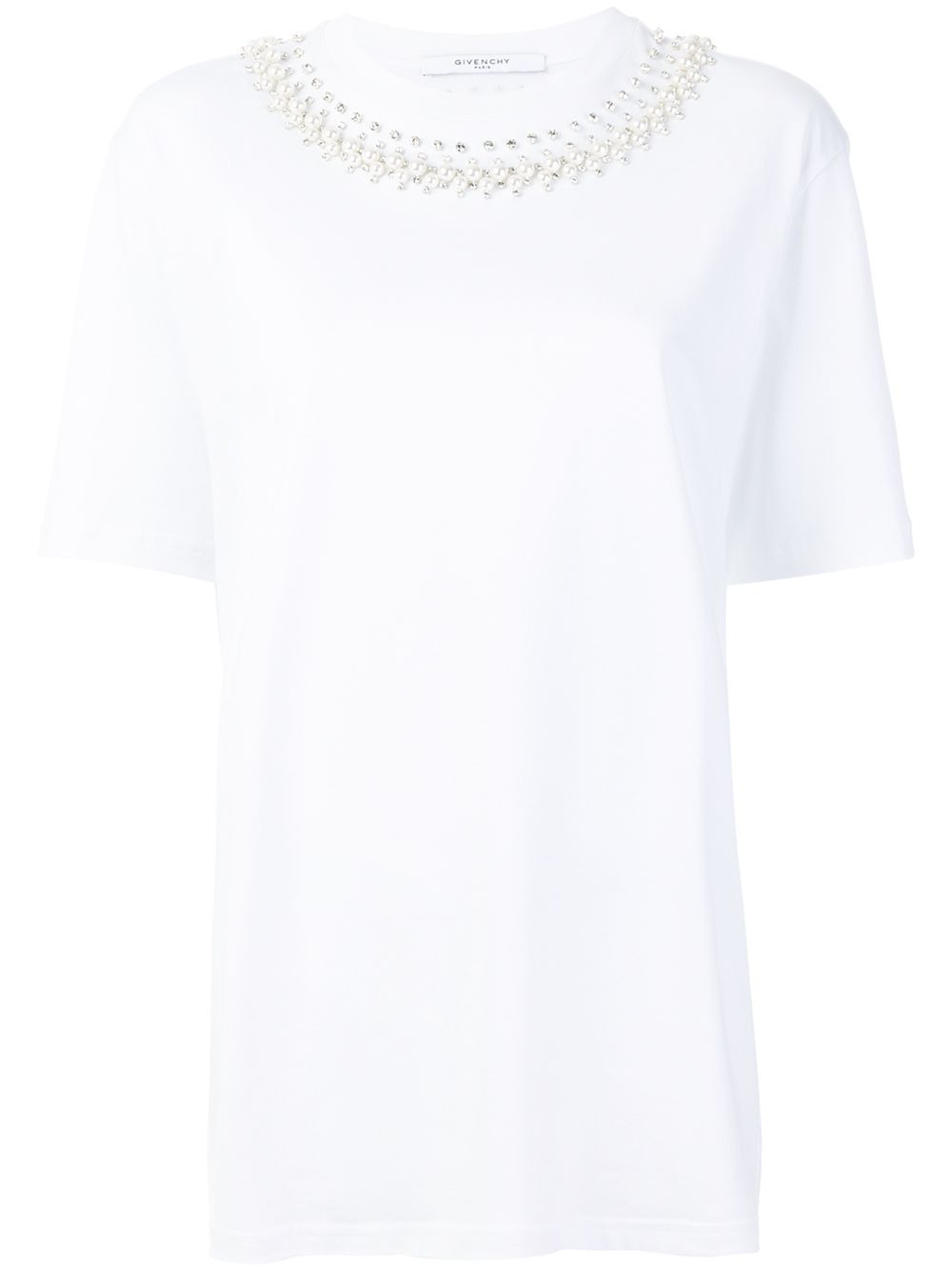embellished-collar T-shirt Infused with the label’s signature dark romanticism and urban styling, French fashion house Givenchy was originally founded in 1952 by acclaimed couturier Hubert de Givenchy. Under the creative direction of Clare Waight Keller, the cult label continues to celebrate the label’s house codes through sharp tailoring and expert craftsmanship. This white cotton embellished-collar T-shirt is a staple piece and features a round neck, short sleeves, a relaxed fit and an embellished collar. Made in Italy Composition Outer: Polyester 100%, glass 100%, Cotton 100% SIZE & FIT Model measurements Height 5 ft 11 in(1.8 m) Bust/Chest 31.49 in(80 cm) Hips 35.82 in(91 cm) Waist 24.8 in(63 cm) Washing instructions Hand Wash