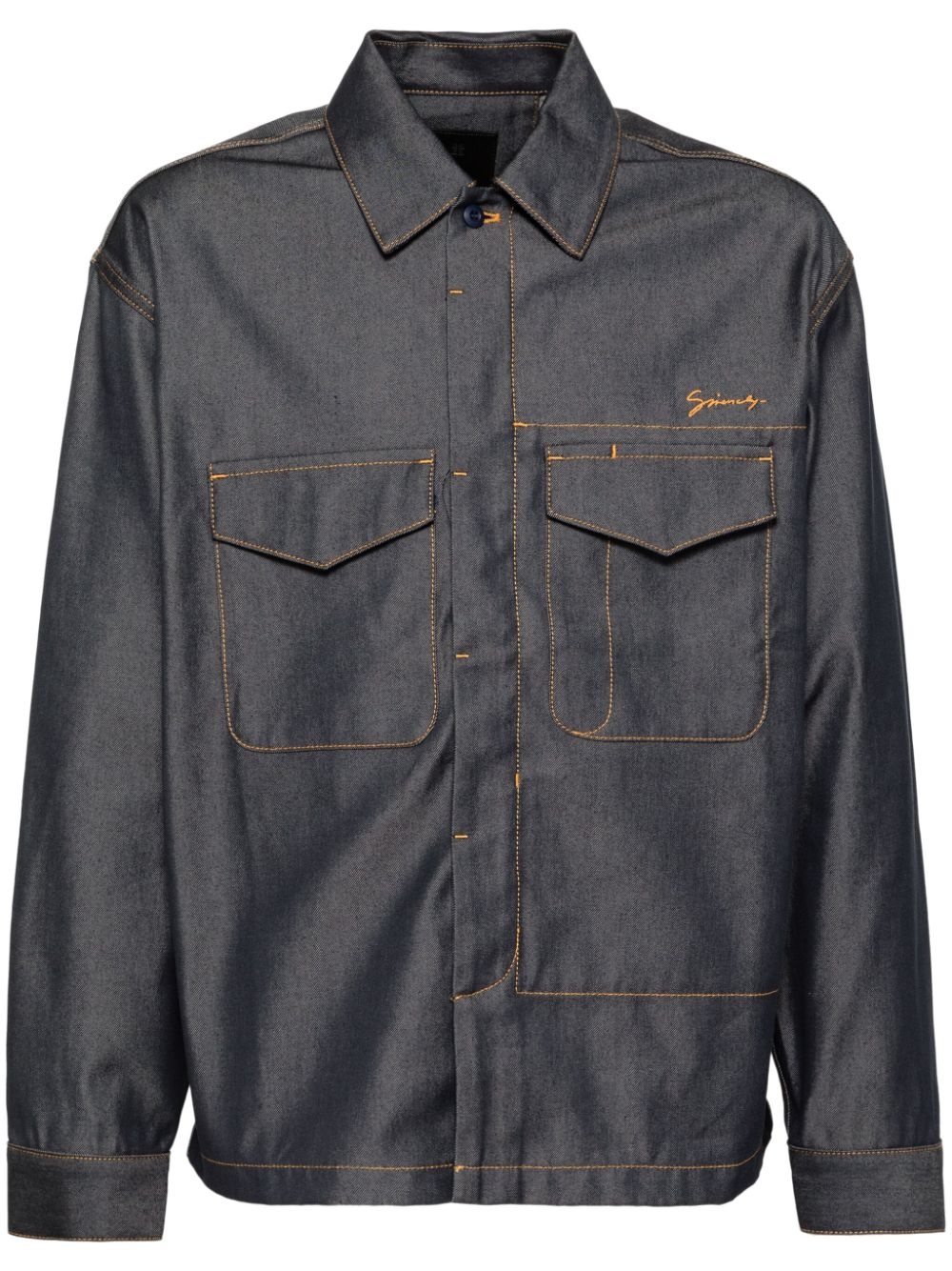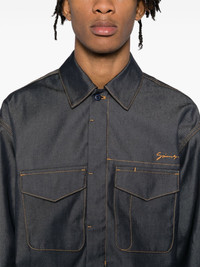 embroidered denim shirt Highlights - Indigo blue - Cotton/silk - Front button fastening - Embroidered logo at the chest - Two chest flap pockets - Contrast stitching - Long sleeves - Buttoned cuffs - Straight hem Made in Italy Composition Body: Cotton 66% Silk 34% SIZE & FIT Model measurements Height 6 ft 3 in(1.9 m) Bust/Chest 35.03 in(89 cm) Hips 36.61 in(93 cm) Waist 29.13 in(74 cm) Measurement CHEST 47.99 in(121.9 cm) SLEEVE LENGTH 25 in(63.5 cm) WAIST 45.98 in(116.8 cm) Shoulder Width 20.51 in(52.1 cm) FittingInformation Designed to be unstructured, offering a loose fit throughout Made from a midweight non-stretch fabric