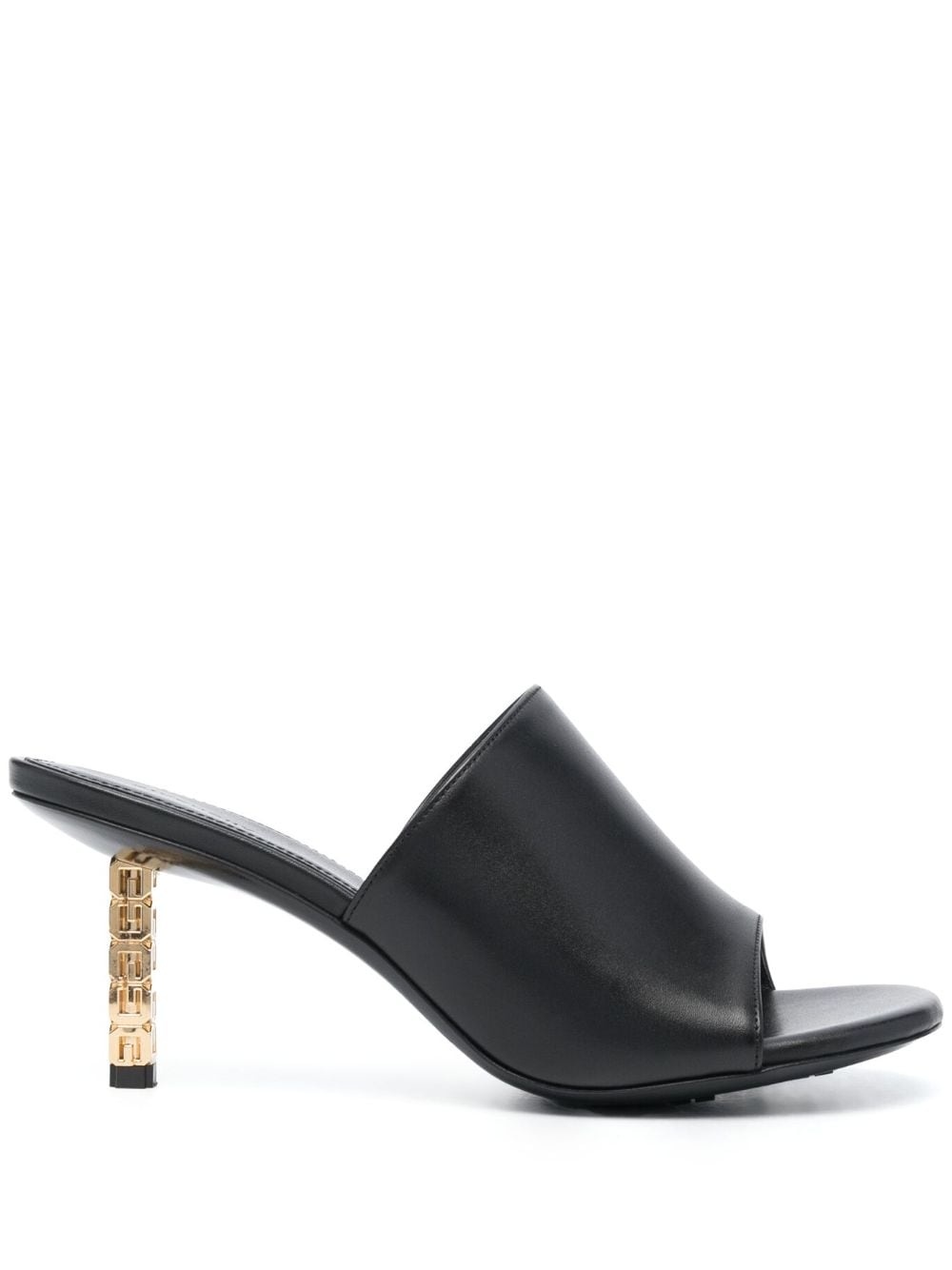 G Cube 75mm leather mules Highlights - Black - Calf leather - Gold-tone hardware - Gold-tone logo plaque - Single toe strap - Round toe - Open toe - 75mm mid sculpted heel - Branded insole Made in Italy Composition Lining: Leather 100% Sole: Rubber 100%, Calf Leather 100% Outer: Calf Leather 100%