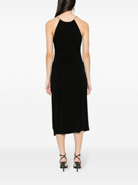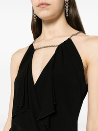 halterneck midi dress Highlights - Black - Jersey texture - Wrap design - Halterneck - Chain-link neck strap - V-neck - Ruffled trim - Gathered detailing - Side slit - Partial lining - Mid-length Made in Italy Composition Viscose 100% SIZE & FIT Model measurements Height 5 ft 11 in(1.8 m) Bust/Chest 31.49 in(80 cm) Hips 36.22 in(92 cm) Waist 25.59 in(65 cm) FittingInformation Designed for a slim fit that sits just away from the body offering a close yet comfortable fit Made from a midweight stretch fabric, this piece offers elasticity and flexibility when worn This piece fits true to size – take your usual size