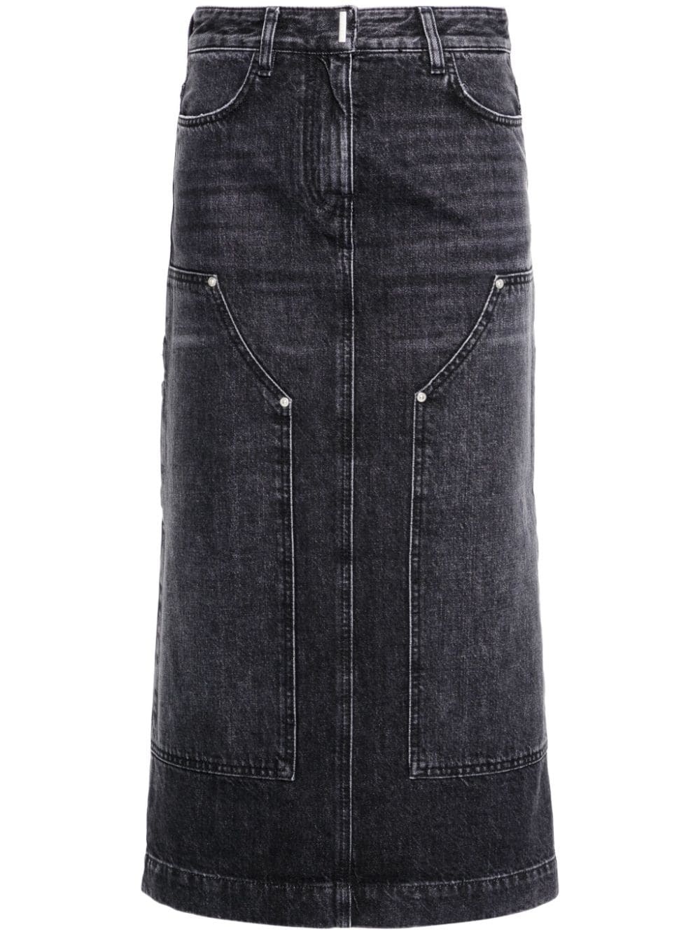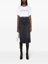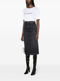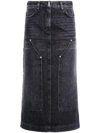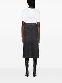 high-rise denim midi skirt Highlights - Black - Cotton - Whiskering effect - Six signature 4g metal plaques - High-waisted - Belt loops - Hook and zip fly fastening - Two rounded pockets to the sides - Four rear patch pockets - Central rear vent - Straight hem - Mid-length Made in Italy Composition Outer: Cotton 100% Lining: Polyester 65%, Cotton 35% SIZE & FIT Model measurements Height 5 ft 11 in(1.8 m) Bust/Chest 34.25 in(87 cm) Hips 35.82 in(91 cm) Waist 24.8 in(63 cm) FittingInformation This midi-length skirt is intended to be worn high on the waist The vented hem offers movement at the rear Sturdy and hard-wearing, this denim piece offers no stretch This piece fits true to size – take your usual size
