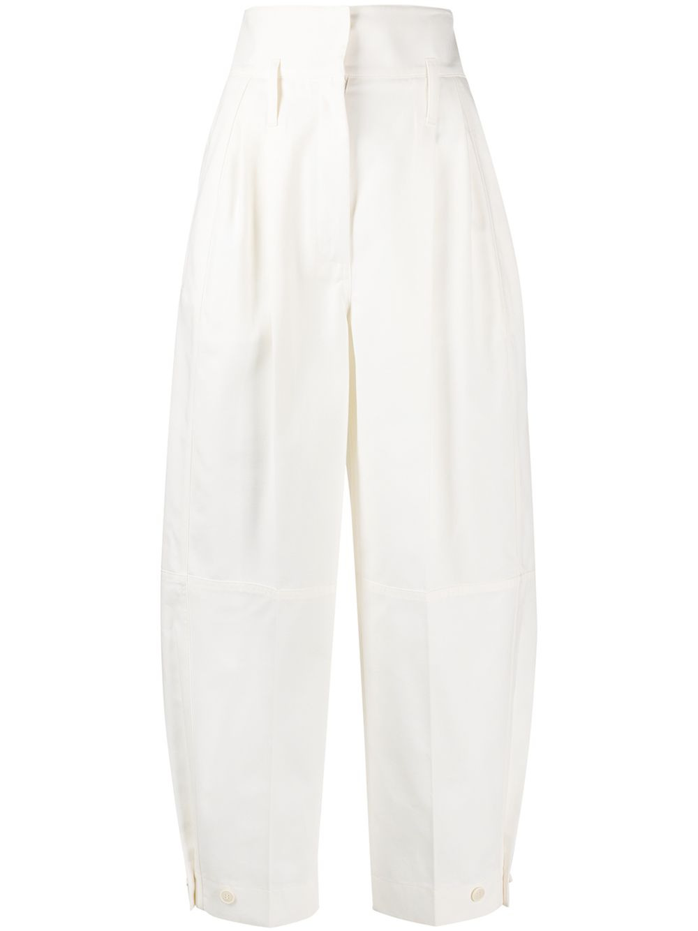 high-waisted balloon trousers Call us Phileas Fogg 'cause we'll be flying high in these white cotton high-waisted balloon trousers from Givenchy. Featuring a cinched waist, a waistband with belt loops, side slit pockets, stitched panels, button cuffs and inverted lapels, we guarantee they'll be in our style rotation for more than 80 days, too! Made in Italy Composition Outer: Cotton 100% Lining: Cotton 100% SIZE & FIT Model measurements Height 5 ft 10 in(1.78 m) Bust/Chest 33.07 in(84 cm) Hips 35.82 in(91 cm) Waist 26.96 in(68.5 cm) FittingInformation This piece fits true to size. We recommend you get your regular size Designed to be fitted at the waist, loose over the leg Made with a mid-weight non-stretch fabric Washing instructions Dry Clean Only