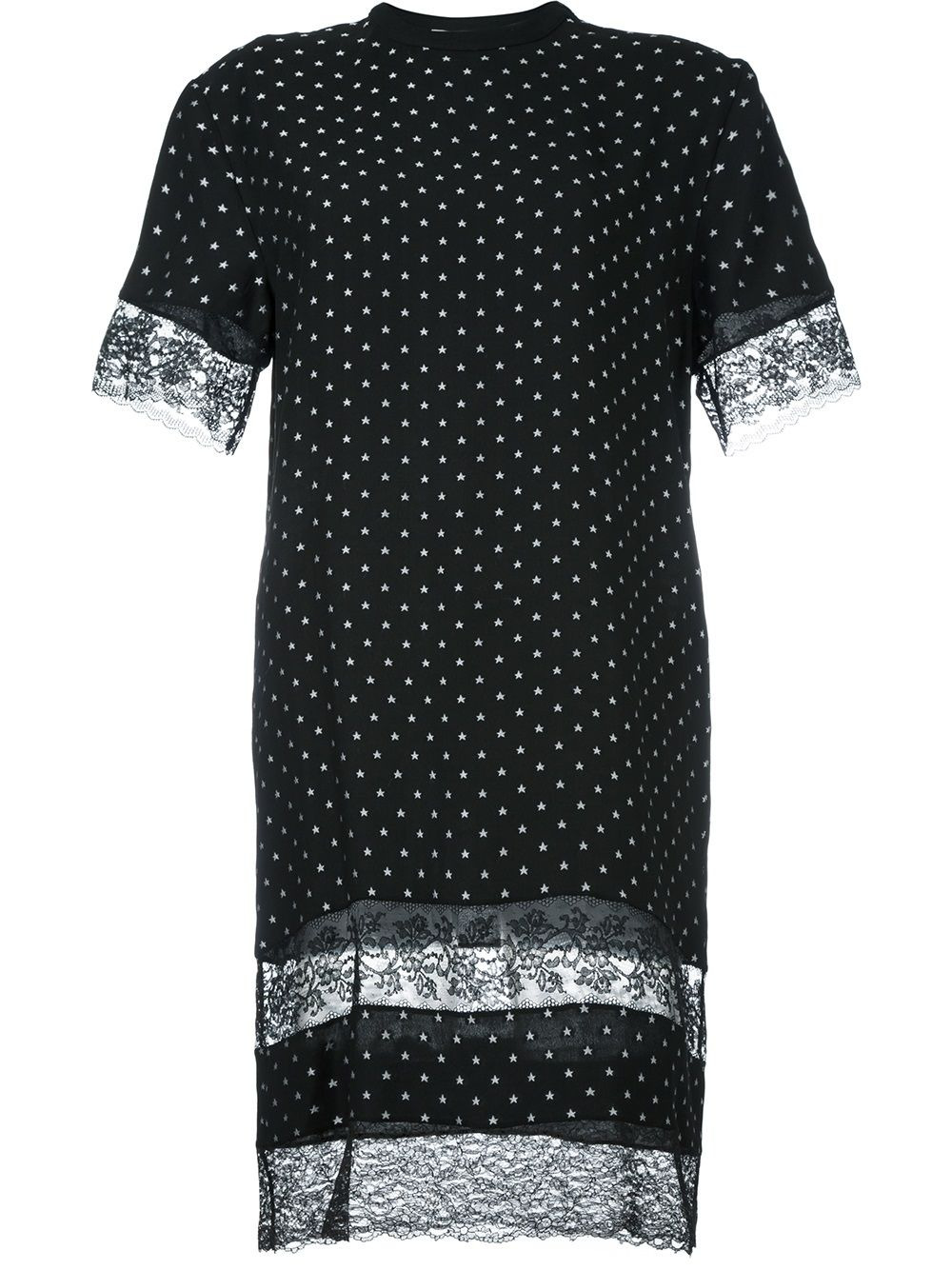lace panel T-shirt dress Black stretch cotton and silk blend lace panel T-shirt dress from Givenchy featuring a round neck, short sleeves and star embroidery. Imported Composition Outer: Polyamide 100%, Cotton 97%, Silk 74%, Polyester 26%, Spandex/Elastane 3% SIZE & FIT Model measurements Height 5 ft 10 in(1.78 m) Bust/Chest 29.92 in(76 cm) Hips 33.07 in(84 cm) Waist 22.04 in(56 cm) Washing instructions Dry Clean Only