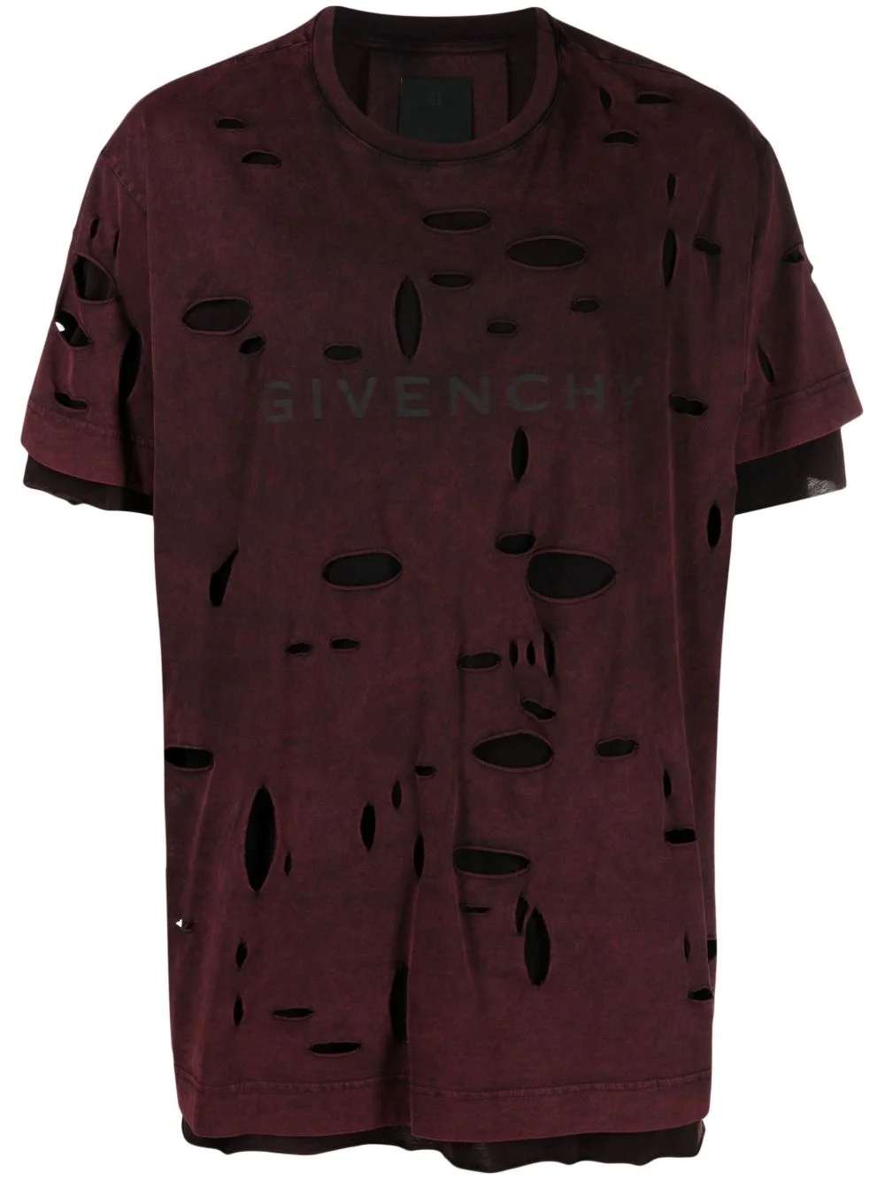 layered-design ripped cotton T-shirt Leaning into the allure of distressed detailing, Givenchy presents this cotton T-shirt with rips appearing throughout. It is cut to a layered design and plays host to a muted logo print across the chest. Highlights - Dark red - Cotton - Ripped detailing - Layered design - Crew neck - Short sleeves - Logo print at the chest - Straight hem Imported Composition Lining: Cotton 100% Outer: Cotton 100% Washing instructions Machine Wash