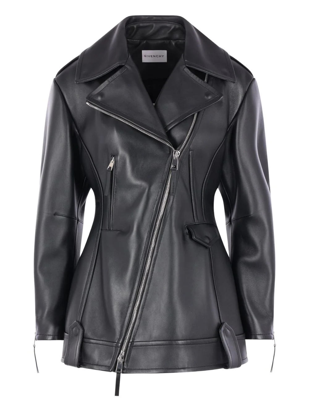 leather biker jacket Highlights - Black - Zip fastening - Point collar - Front zip pocket - Long sleeves - Silver-tone hardware Made in Italy Composition Outer: Lambskin 100% Lining: Viscose 100%, Polyester 100% Washing instructions Read Manufacturer Guidelines