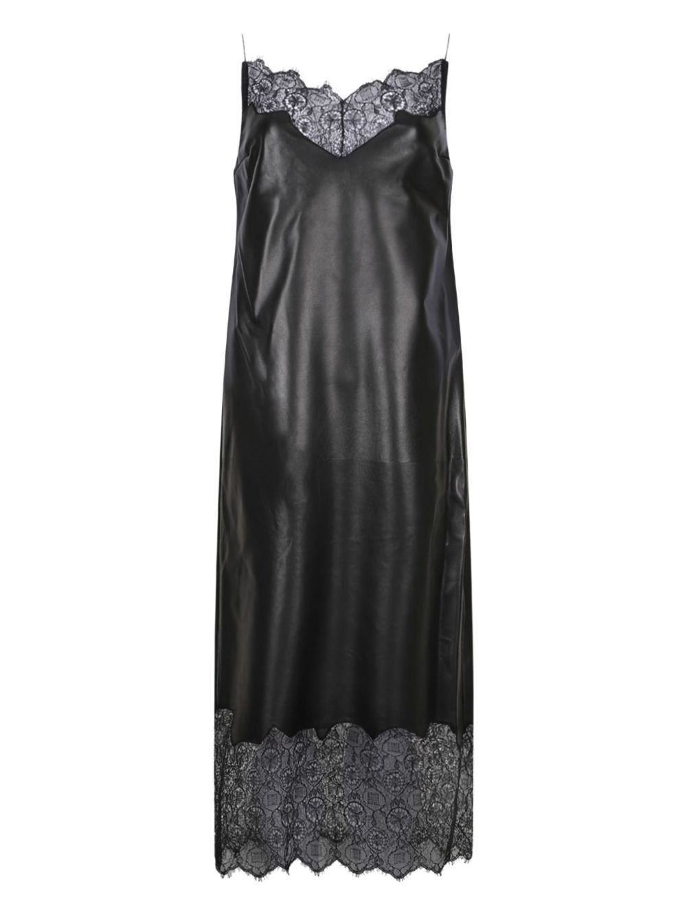 leather midi dress Highlights - Black - Concealed side zip fastening - V-neck - Spaghetti straps - Lace panelling Made in Italy Composition Lambskin 100%, Polyamide 78%, Cotton 22%