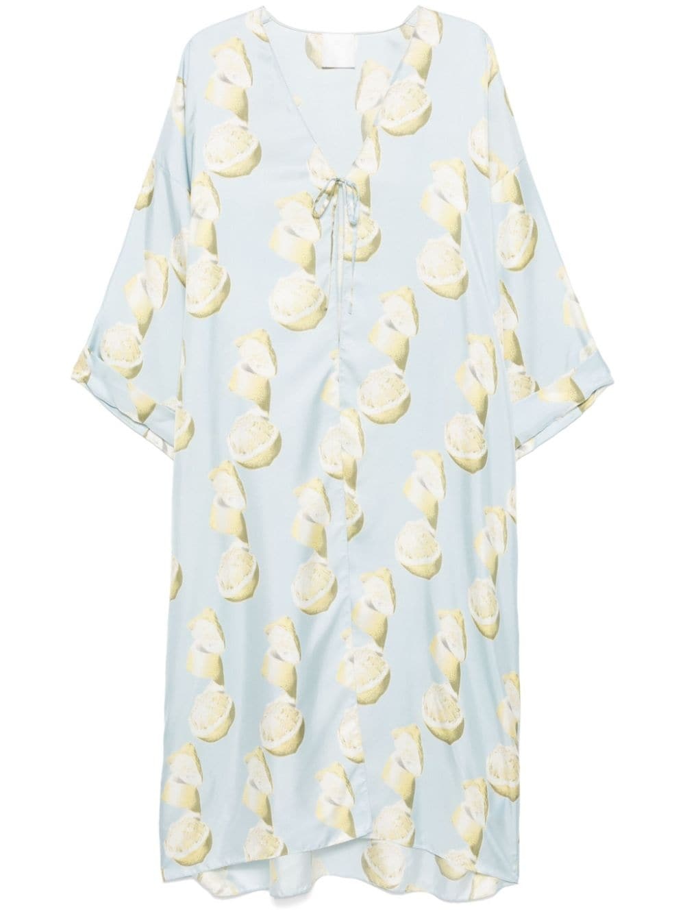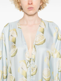 lemon-print kaftan Highlights - Light blue - Silk - Satin finish - Twill weave - All-over lemon print - Front tie fastening - V-neck - Drop shoulder - Long sleeves - Turn-up cuffs - Kaftan silhouette - Straight hem - Long length Made in Italy Composition Silk 100% SIZE & FIT Model measurements Height 5 ft 9 in(1.75 m) Bust/Chest 34.64 in(88 cm) Hips 36.61 in(93 cm) Waist 26.37 in(67 cm) FittingInformation Designed to be unstructured, offering a loose fit throughout Made from a lightweight non-stretch fabric