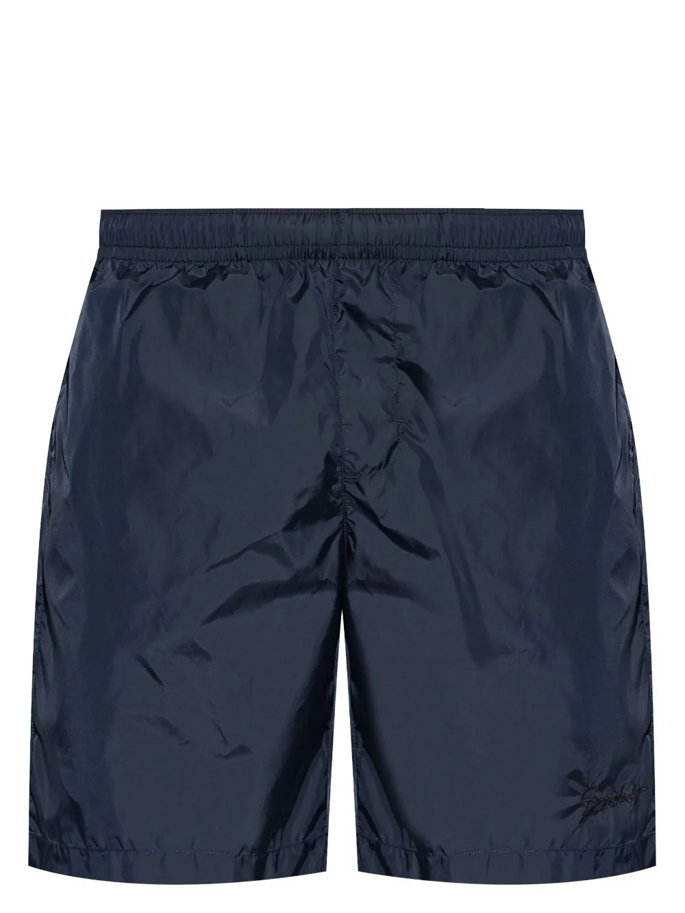 logo-embroidered shorts Highlights - Navy blue - Textured finish - Embroidered logo to the side - Elasticated waistband - Two side welt pockets - Thigh-length - Be mindful to try on swimwear over your own garments. Made in Italy Composition Polyamide 100%