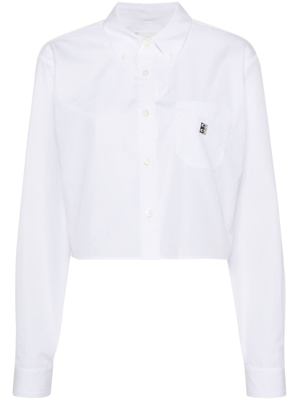 logo-plaque shirt Favouring simplicity, this white Givenchy shirt is cut from crisp cotton poplin to a relaxed, cropped silhouette solely punctuated by a silver-tone 4G logo plaque at the chest, lending a hint of glistening branding. Highlights - White - Cotton - Poplin texture - Button-down collar - Long sleeves - Buttoned cuffs - Chest patch pocket - Silver-tone logo plaque - Rear box-pleat detail - Internal logo patch - Straight hem - Cropped - Front button fastening Made in Italy Composition Cotton 100% SIZE & FIT Model measurements Height 5 ft 11 in(1.8 m) Bust/Chest 32.67 in(83 cm) Hips 36.22 in(92 cm) Waist 24.4 in(62 cm) FittingInformation Designed for a relaxed fit, this piece allows for comfort and movement when worn Cropped in length Made from a midweight non-stretch fabric This piece fits true to size – take your usual size Measurement SLEEVE LENGTH 24.01 in(61 cm) LENGTH 17.51 in(44.5 cm) WAIST 39.01 in(99.1 cm) BUST 40.98 in(104.1 cm)