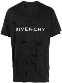 logo-print T-shirt In faded black, this Givenchy T-shirt is handcrafted from pure cotton. With a contrasting white print on the front, the top is finished with a distressed design. Highlights - Black/white - Cotton - Soft jersey - Logo print to the front - Crew neck - Layered details - Cut-out detailing - Short sleeves - Straight hem Imported Composition Outer: Cotton 100% Lining: Cotton 100% SIZE & FIT Model measurements Height 6 ft 2 in(1.88 m) Bust/Chest 35.03 in(89 cm) Hips 35.82 in(91 cm) Waist 27.95 in(71 cm) FittingInformation Designed for an oversized fit, offering additional room throughout Made from a midweight non-stretch fabric, this piece offers minimal elasticity when worn This piece fits true to size – take your usual size