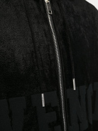 logo-print zip-up hoodie black cotton blend logo print at the chest drawstring hood front zip fastening two side slit pockets elasticated cuffs long sleeves elasticated hem Made in Italy Composition Viscose 44%, Cotton 35%, Polyamide 21% SIZE & FIT Model measurements Height 6 ft 1 in(1.85 m) Bust/Chest 35.82 in(91 cm) Hips 37.79 in(96 cm) Waist 29.13 in(74 cm) FittingInformation This piece fits true to size. We recommend you get your regular size Cut for a loose fit Made with a mid-weight fabric Washing instructions Dry Clean Only