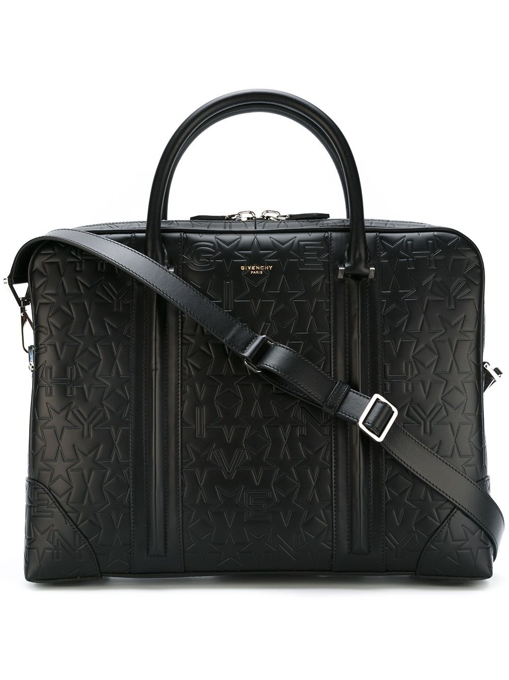 'Lucrezia' briefcase Black calf leather 'Lucrezia' briefcase from Givenchy featuring round top handles, a front centre logo stamp, a detachable and adjustable shoulder strap, silver-tone hardware, a top zip closure, a full lining, an internal zipped pocket, an internal logo plaque and a logo embossed exterior. Made in Italy SIZE & FIT Measurement WIDTH 14.96 in(38 cm) HEIGHT 11.02 in(28 cm) HANDLE 3.93 in(10 cm) DEPTH 2.36 in(6 cm) STRAP 21.65 in(55 cm)