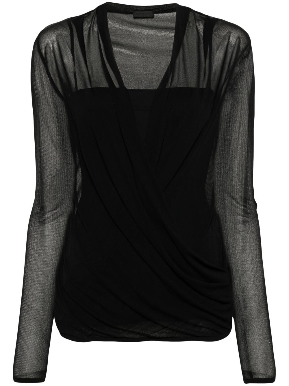 mesh wrap blouse Highlights - Black - Mesh design - Wrap design - V-neck - Long sleeves - Straight hem - Detachable slip tank top Made in Italy Composition Acetate 65%, Polyamide 35% SIZE & FIT Measurement SLEEVE LENGTH 27.55 in(70 cm) LENGTH 25.19 in(64 cm) WAIST 26.77 in(68 cm) Washing instructions Dry Clean Only
