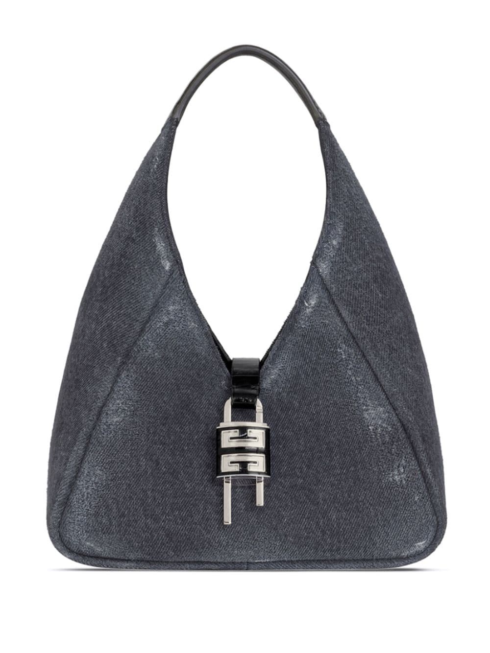 mini G-Lock denim shoulder bag Inspired by the padlocks hung on Parisian bridges, the iconic 4G metal motif details the V-shaped topline of this Givenchy shoulder bag. A crocodile-effect embossed leather strap holds up its mini denim construction. Highlights - Black/blue - Cotton/leather - Denim - Silver-tone hardware - Signature 4g motif - Internal logo patch - Crocodile-effect embossed leather strap - Buckle fastening - Single top handle - Main compartment - Metal feet Made in Italy Composition Cotton 100%, Leather 100%