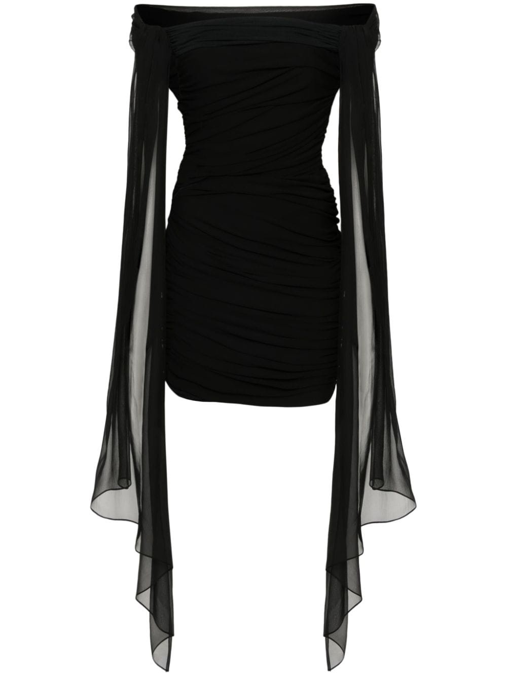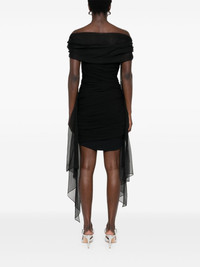 off-shoulder draped mini dress Highlights - Black - Stretch-jersey - Draped design - Semi-sheer panels - Off-shoulder - Short sleeves - Sash detail - Thigh-length - Full lining - Asymmetric hem - Concealed side zip fastening Made in Italy Composition Outer: Viscose 92%, Elastane 8% Lining: Polyamide 82%, Elastane 18% SIZE & FIT Model measurements Height 5 ft 10 in(1.77 m) Bust/Chest 32.28 in(82 cm) Hips 35.03 in(89 cm) Waist 25.19 in(64 cm) FittingInformation Designed for a close fit throughout Made from a midweight stretch fabric, this piece offers elasticity and flexibility when worn This piece fits true to size – take your usual size Washing instructions Dry Clean Only