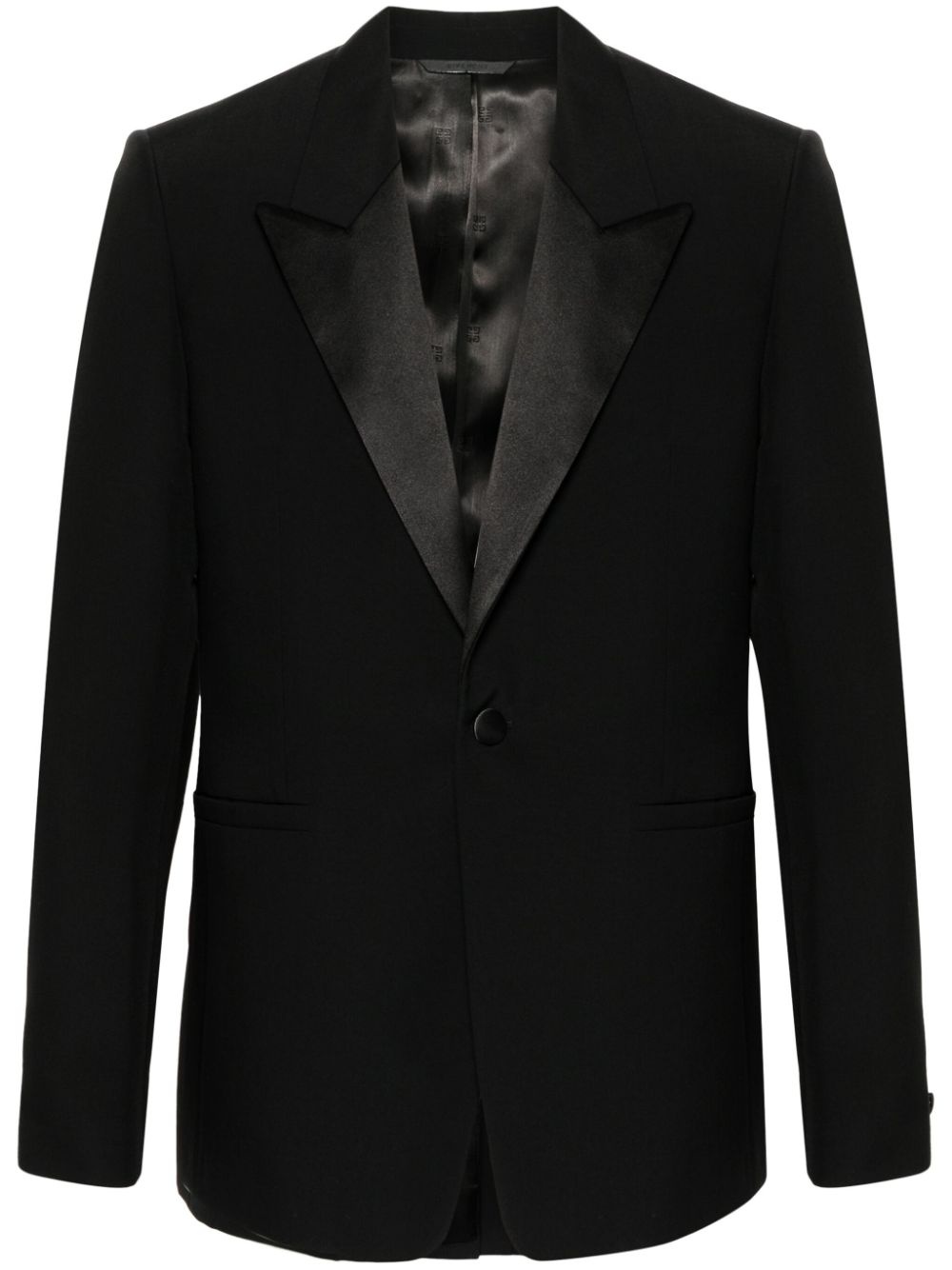 peak-lapel single-breasted wool blazer Highlights - Black - Wool - Peak lapels - Front button fastening - Long sleeves - Buttoned cuffs - Two front welt pockets - American rear vent - Satin lining - Logo-jacquard lining Made in Italy Composition Outer: Wool 100%, Silk 70%, Polyester 30% Lining: Cupro 100% SIZE & FIT Model measurements Height 6 ft 2 in(1.87 m) Bust/Chest 38.18 in(97 cm) Hips 36.61 in(93 cm) Waist 29.13 in(74 cm) FittingInformation Designed for a slim fit, offering a comfortable fit that sits just away from the body The internal shoulder pads offer a structured shape Made from a midweight non-stretch fabric This piece fits true to size – take your usual size