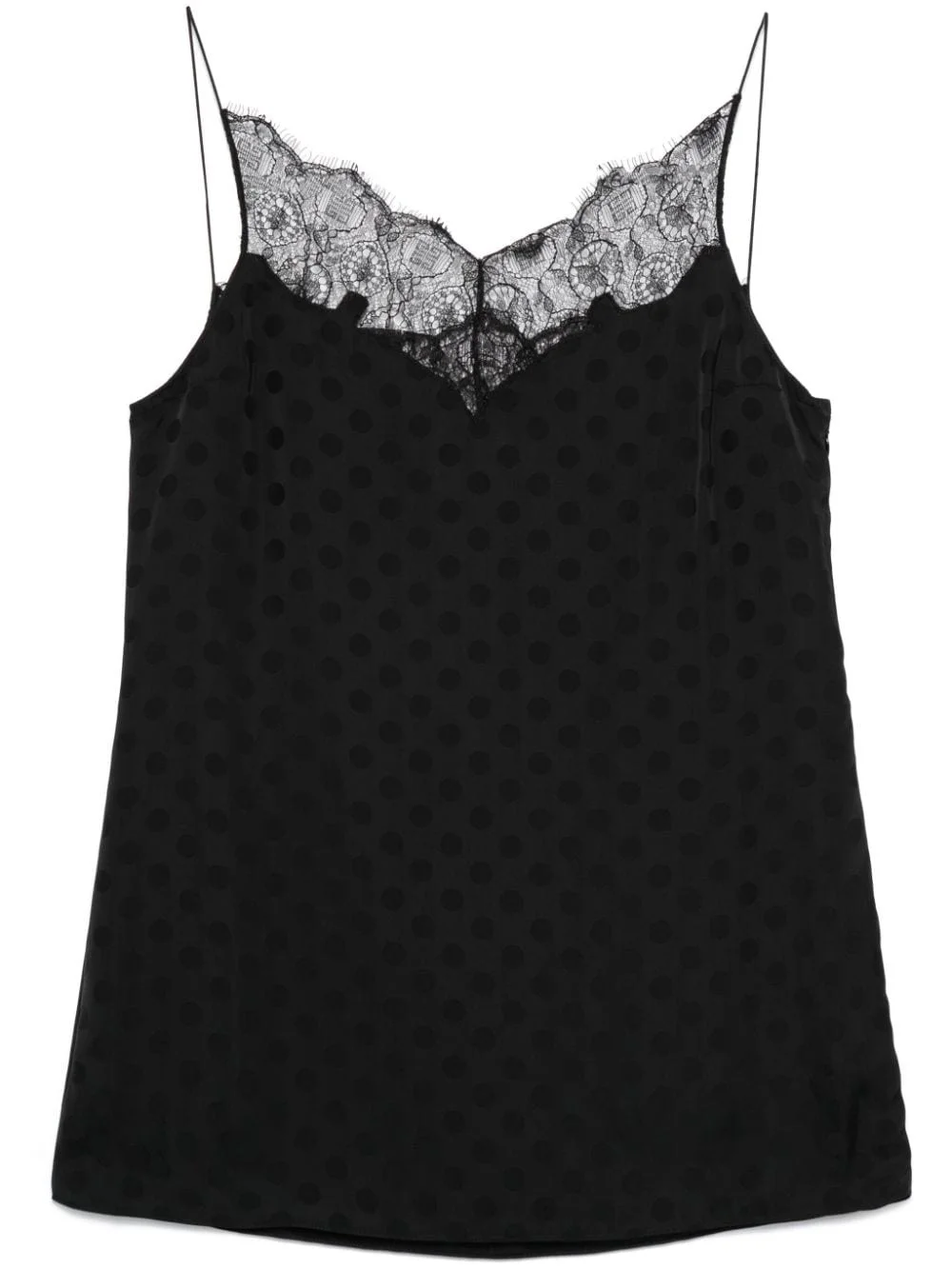 polka-dot tank top Highlights - Black - Satin finish - Polka dot jacquard - Concealed side zip fastening - Guipure lace-trim neckline - Spaghetti straps - Slip silhouette - Rear curved hem Made in Italy Composition Viscose 100%, Polyamide 78%, Cotton 22% Washing instructions Dry Clean Only