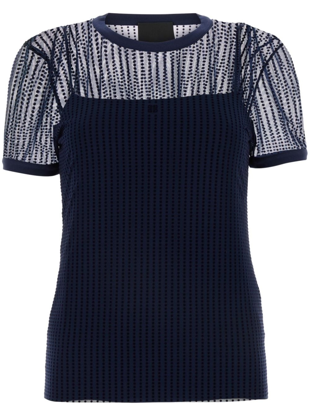 polka dot tulle t-shirt Highlights - Navy blue - Polka dot embroidery - Tulle panel - Flocked finish - Crew neck - Short sleeves - Signature 4g motif - Straight hem Imported Composition Outer: Polyamide 82%, Elastane 18% Lining: Acetate 73%, Silk 27% Washing instructions Hand Wash