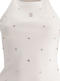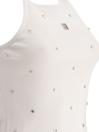 rhinestone-embellished top Highlights - White - Rhinestone embellishment - Applique logo - Sleeveless - Spaghetti straps - Crew neck - Straight hem Made in Italy Composition Viscose 100%, Cotton 98%, Elastane 2%